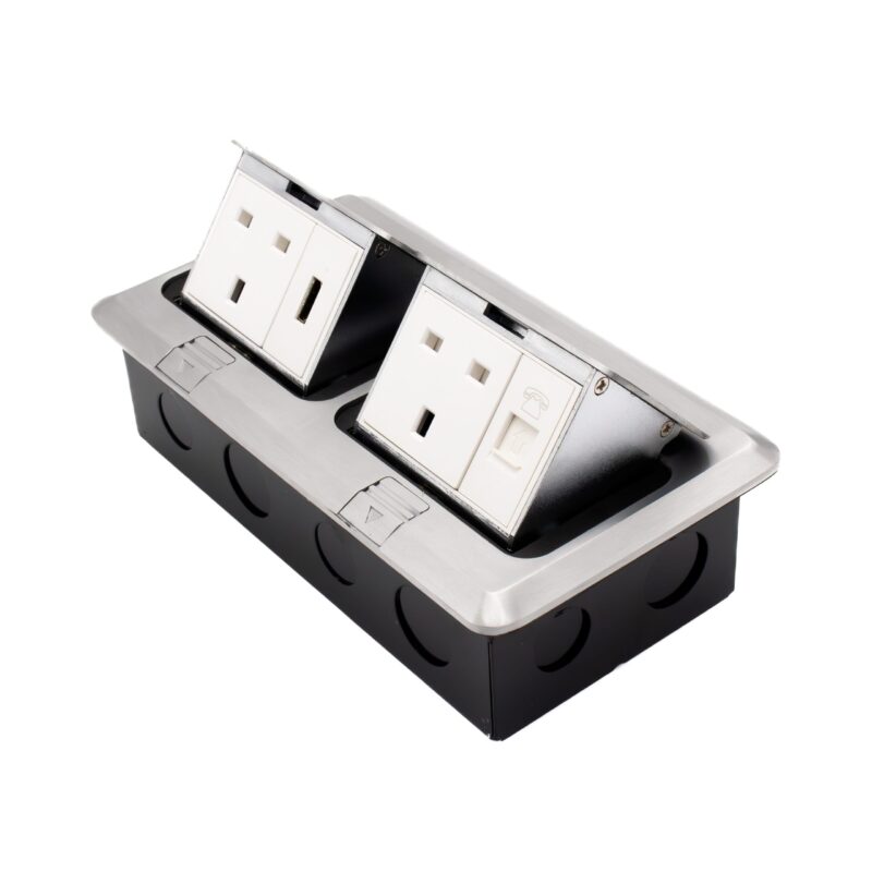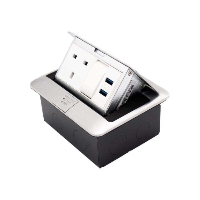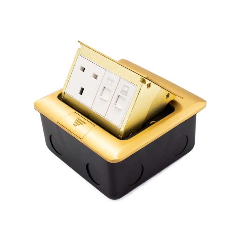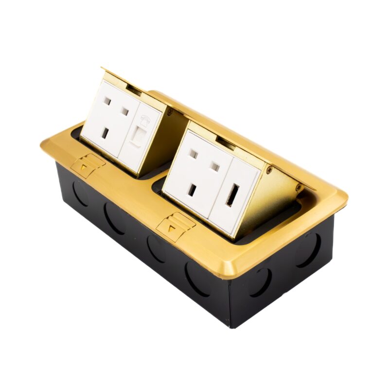 The AP20G Admore 2 Gang 13A Socket is a stylish and functional power solution, perfect for modern homes and offices. Featuring a brushed gold finish and a soft-open popup mechanism, this socket seamlessly integrates into any environment. It provides two 13A Type G power outlets, along with convenient USB Type-A and Type-C charging ports, and a RJ45 data port, ensuring all your connectivity needs are met.